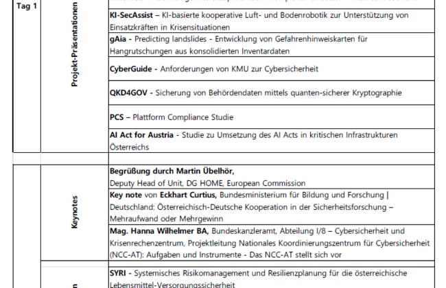 Neben den Verantwortlichen der bereits geförderten Projekte wurde auch ein vom BMF definierter Personenkreis (Fach-Community) eingeladen. Ziel war es, einerseits hochwertige Projekte einem Fachpublikum vorzustellen, aber auch das Netzwerken in der Community zu stärken und das Thema Sicherheitsforschung einem interessierten Kreis zugänglich zu machen.